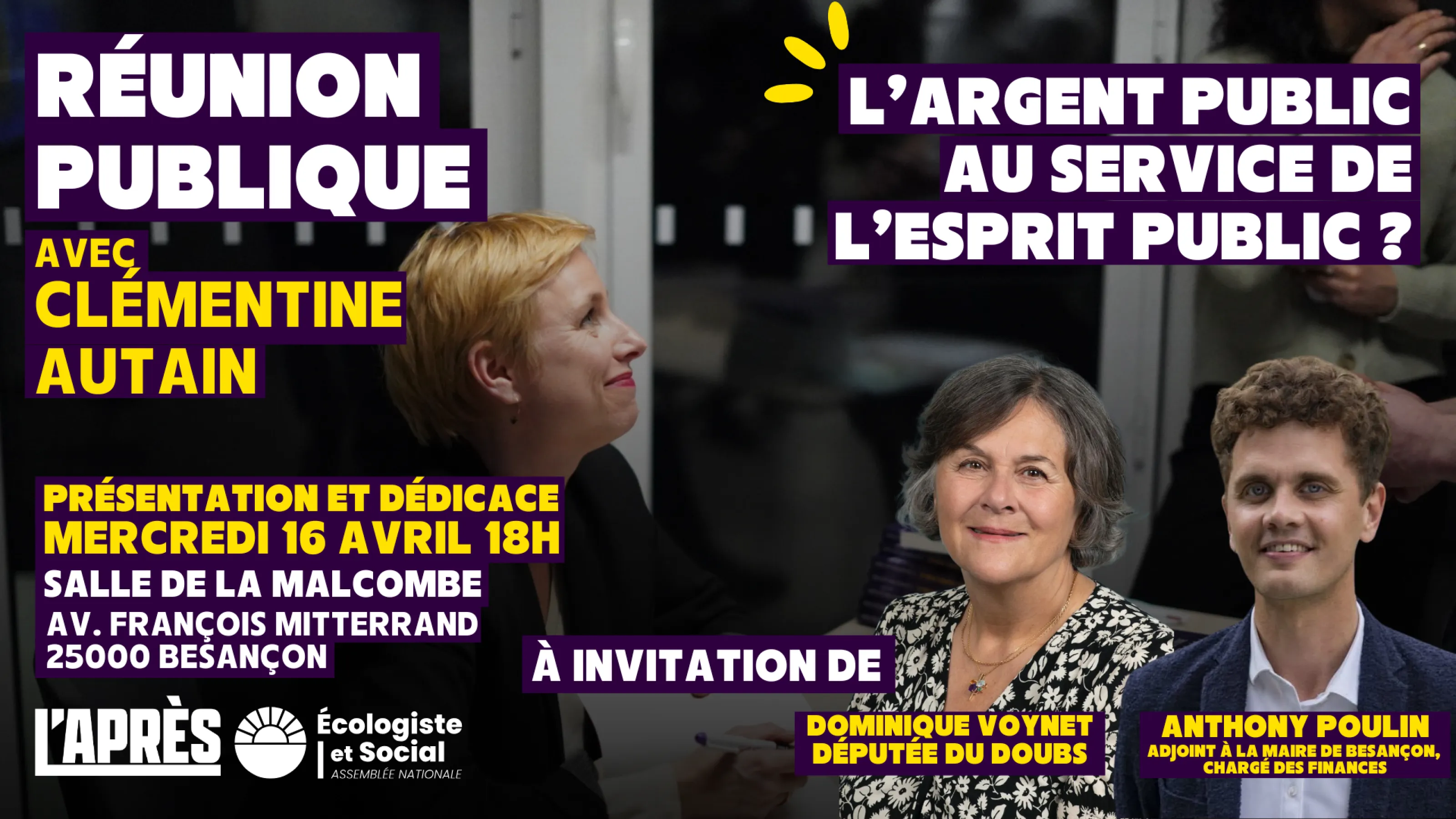 Dominique Voynet, députée écologiste du Doubs, invite Clémentine Autain, députée et journaliste, pour un débat public sur les enjeux budgétaires et leur impact sur nos territoires. Elle interviendra au côté d’Anthony Poulin, adjoint à la maire de Besançon en charge des finances, et suppléant de Dominique Voynet.